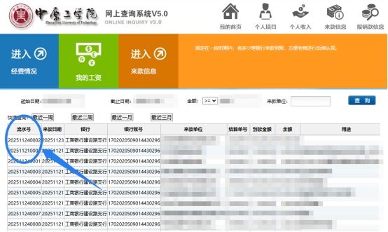 输入来款单位名称或金额,查看来款信息(已认领经费将不再显示),并记录来款信息显示的【流水号】。